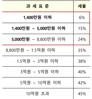 1,400만원 이하는 6%의 세율이 적용되며 1,400만 원 ~ 5,000만 원 이하는 15%의 세율이 적용됩니다.